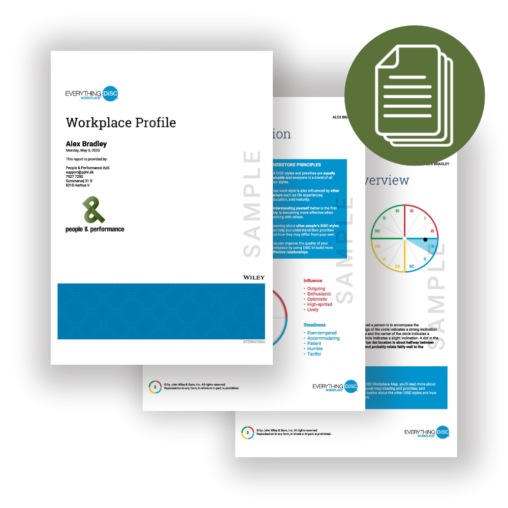 Everything DiSC® Workplace® transforms assessment results into a 20-page narrative profile that’s easy to understand, remember, and apply. The easiness occurs through an easy understandable connection between DiSC models and text. The profile shows each person’s communication and motivation styles and how they can adapt it to work more effectively with others. The result? Less conflict. More trust and synergies. Better teamwork and results.