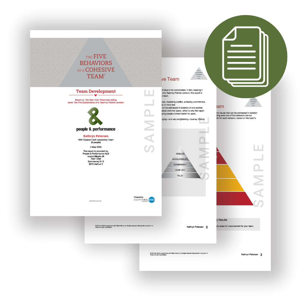 No preparation required. Each team member completes the assessment and is introduced to the Five Behaviors® model, giving the team a shared language for development.